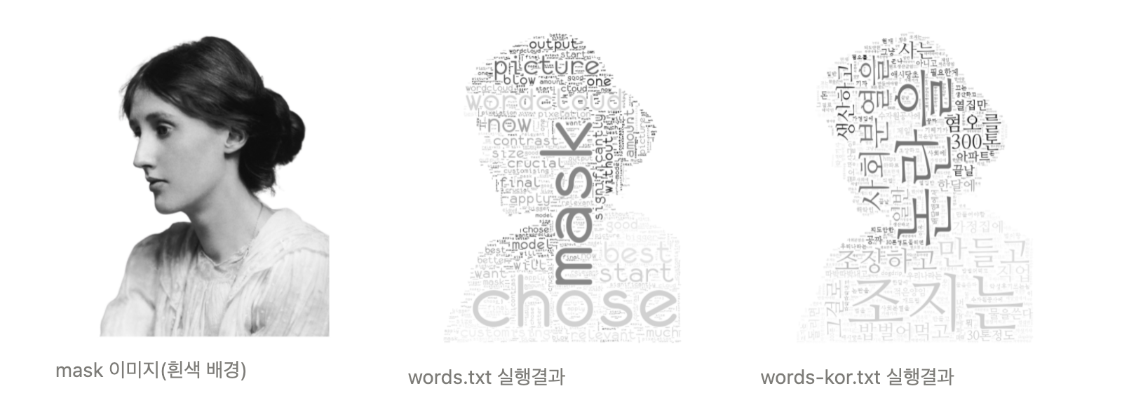 워드 리스트(또는 문장)과 mask로 사용할 이미지를 넣으면, 이에 맞춰 오른쪽 그림과 같은 결과물을 만드는 방법에 대해 설명한다. 한글을 적용하는 과정에서의 델타사항을 제외한 모든 내용은 원문의 내용을 따랐다.